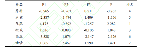 通過(guò)計(jì)算得到不同烹飪方式的芫根的綜合品質(zhì)得分,得分高低反映芫根品質(zhì)的高低,如表5所示,PC1中得分最高的是氣蒸芫根和油炒芫根,說(shuō)明PC1對(duì)這兩種方式烹飪的芫根品質(zhì)有較大影響;PC2中微波的芫根得分最高,說(shuō)明ABTS抗氧化能力對(duì)其品質(zhì)影響最大;PC3中新鮮芫根得分最高。根據(jù)綜合評(píng)分排名情況來(lái)看,不同烹飪方式處理后的芫根品質(zhì)存在較大差異,氣蒸芫根綜合得分最高,其次是油炒芫根,高壓芫根得分最低。