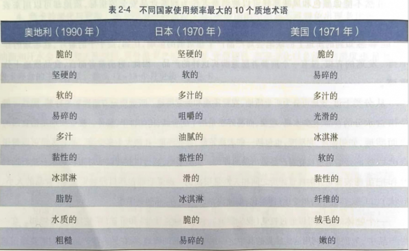 一定的質(zhì)地術(shù)語和感覺可以跨越文化的差異,具有國際性。因此,任何國家、文化或地區(qū)的感官專家應當不僅僅注意食品可感知到的風味、味道和顏色的量值,而且要注意能感知到的質(zhì)地特征。有研究表明:不同國家的質(zhì)地描述詞匯大多數(shù)是相同的,如表2-4所示。