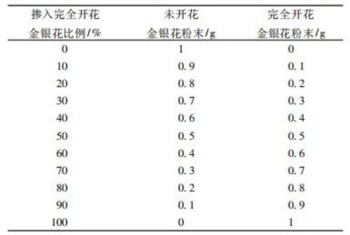 金銀花(未開花干花、完全開花干花);HeraclesⅡ超快速氣相電子鼻。 未開花與完全開花金銀花打粉,過4號(hào)篩,取過篩后的未開花與完全開花金銀花粉末調(diào)配為總量為1g待測樣品,充分震蕩混勻,具體調(diào)配比例見表1,并以此分組。
