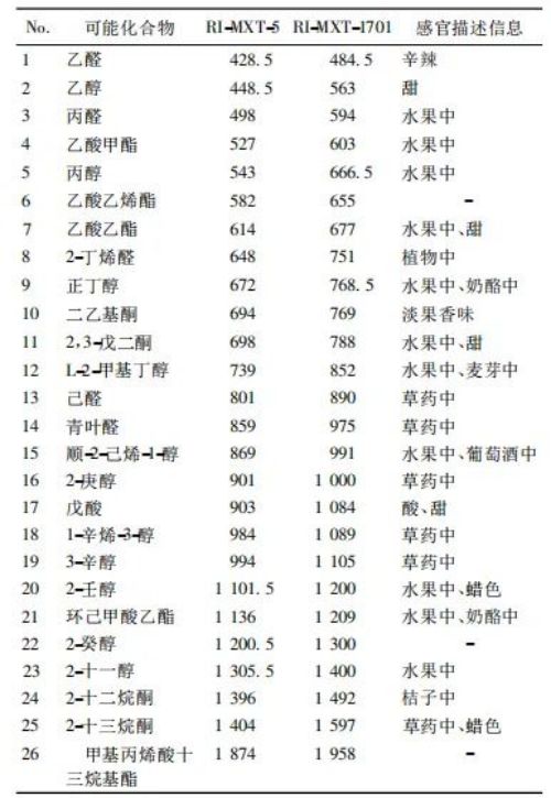 HeraclesⅡ超快速氣相色譜電子鼻具有兩根極性存在差異的色譜柱,即MXT-5(低極性)和MXT-1701(中極性),扣去空白參考后,各比例金銀花粉末色譜圖見圖1,2。不同比例金銀花粉末色譜圖中的色譜峰位置基本未發(fā)生變化,說明其基于氣味的定性較為類似,將保留時(shí)間轉(zhuǎn)換為Kovats保留指數(shù)后,經(jīng)AroChembase數(shù)據(jù)庫得出定性結(jié)果,見表3。