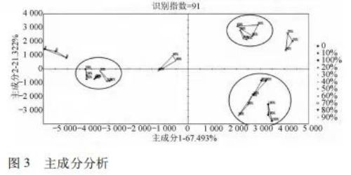 PCA是將所得的數(shù)據(jù)進(jìn)行降維,提取幾個(gè)特征值較大能反映樣本信息變量的因子進(jìn)行線性分類,以得到具有不同氣味區(qū)域和簇的描述性圖表。在經(jīng)過超快速氣相電子鼻檢測得到不同調(diào)配比例金銀花粉末的色譜峰面積以及峰數(shù)量后,篩選出區(qū)分能力強(qiáng)(>0.900)且峰面積較大(range>1000)分離效果較好的色譜峰作為傳感器,進(jìn)行PCA分析,得出主成分1與主成分2累計(jì)貢獻(xiàn)率88.815%,能夠較好地反映所測樣品中氣味信息。識(shí)別指數(shù)91,說明超快速氣相電子鼻可有效區(qū)分不同調(diào)配比例金銀花粉末,見圖3。此外,10%~20%,20%~30%,50%~60%,80%~90%,90%~100%間區(qū)分較為困難。據(jù)此,可將不同調(diào)配比例金銀花粉末可分為6類,即①0;②10%,20%,30%;③40%;④50%,60%;⑤70%;⑥80%,90%,100%。