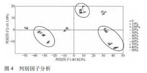 DFA是在主成分分析的基礎(chǔ)上,縮短組內(nèi)樣品間距離,增大組間差距。因此,本研究以主成分分析中所采用的傳感器,進(jìn)行判別因子分析,結(jié)果見圖4。由此可知,各調(diào)配比例的金銀花粉末可通過超快速氣相電子鼻進(jìn)行快速鑒別,而且區(qū)分效果較好,所得趨勢及結(jié)果與主成分分析基本相同,使PCA結(jié)果得到進(jìn)一步驗(yàn)證。