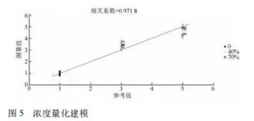 濃度量化建模采用的方法為偏最小二乘法(PLS),可使色譜圖數(shù)據(jù)與濃度值間建立線性關(guān)系,起到對(duì)未知樣品濃度進(jìn)行預(yù)測的作用。本實(shí)驗(yàn)中采用預(yù)先調(diào)配的金銀花粉末,將摻入完全開花粉末比例設(shè)為濃度,即濃度量化建模中的因變量,以所測得氣相色譜圖數(shù)據(jù)作為自變量,進(jìn)行濃度量化建模。為實(shí)現(xiàn)較好的鑒別結(jié)果,將PCA及DFA組間區(qū)分較為良好的0,40%,70%完全開花金銀花粉末摻入比例作為節(jié)點(diǎn),并將0,40%,70%濃度分別設(shè)為1,3,5,進(jìn)行濃度量化建模,所得結(jié)果見圖5,相關(guān)系數(shù)為0.9718。建模后,將10%,20%,30%,50%,60%,80%,90%,100%的原始色譜數(shù)據(jù)進(jìn)行投影驗(yàn)證,可得到較好的濃度預(yù)測結(jié)果,模型良好。另外,根據(jù)此模型,可實(shí)現(xiàn)基于摻入完全開花金銀花粉末比例的質(zhì)量分級(jí),即濃度預(yù)測結(jié)果小于3,為金銀花粉末中摻入完全開花粉末量低于40%,列為一等;濃度預(yù)測結(jié)果不低于3且小于5,為金銀花粉末中摻入完全開花粉末量在40%~70%,列為二等;濃度預(yù)測結(jié)果不低于5,為金銀花粉末中摻入完全開花粉末量不低于70%,列為三等。