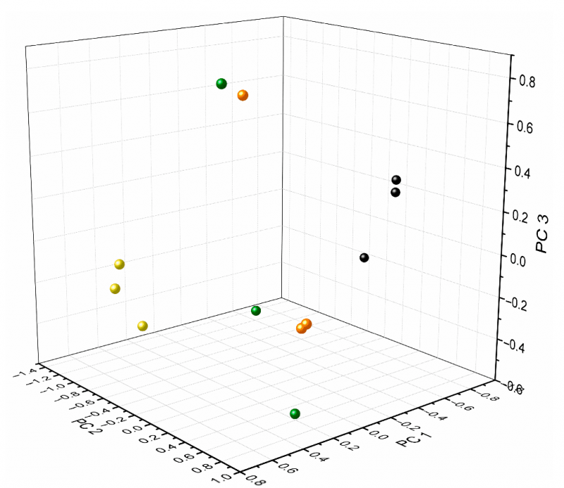 電子舌的主成分分析(PCA)結果表明,受感染的樣本可與 AUM 區(qū)分開來,而肺炎雙球菌可與其他物種區(qū)分開來。見下圖,黑色點是單純AUM,黃色點是肺炎雙球菌感染的AUM,綠色點是糞腸球菌感染的AUM,橙色是大腸桿菌感染的AUM。