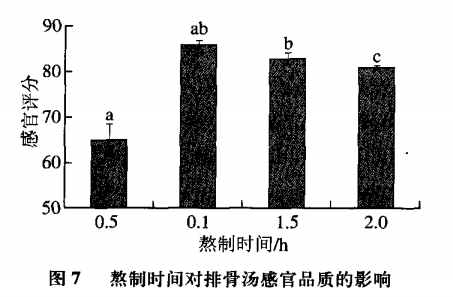 由圖7可知 ,隨著湯汁熬制時(shí)間的增加,排骨湯的感官評(píng)分呈先升高后降低的趨勢(shì)。當(dāng)熬制時(shí)間為1.0h時(shí),排骨湯的感官評(píng)分最高,與熬制0.5h和 1.5h的樣品沒(méi)有顯著差異 (P>0.05),但與熬制2.0h的樣品存在顯著差異 (P<0.05)。