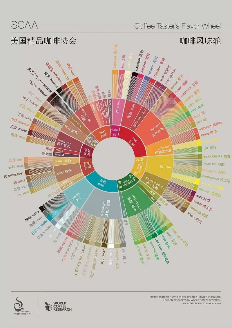 隨著食品行業(yè)工業(yè)化的快速發(fā)展,感官風(fēng)味輪涉及的領(lǐng)域越來越廣泛,比如中國近幾年出現(xiàn)的白酒、茶葉、陳醋等感官風(fēng)味輪。同時,專家們對于各自領(lǐng)域的感官風(fēng)味輪研究越來越深入,比如咖啡領(lǐng)域的第一版風(fēng)味輪是Ted Lingle與The Coffee Brewing Institute基于化學(xué)層面的研究于1983年構(gòu)建起來,第二版風(fēng)味輪是SCAA基于感官層面的研究于2016年構(gòu)建的。這不僅拓展了人們對咖啡風(fēng)味的新認(rèn)知,也為咖啡領(lǐng)域的發(fā)展助力。