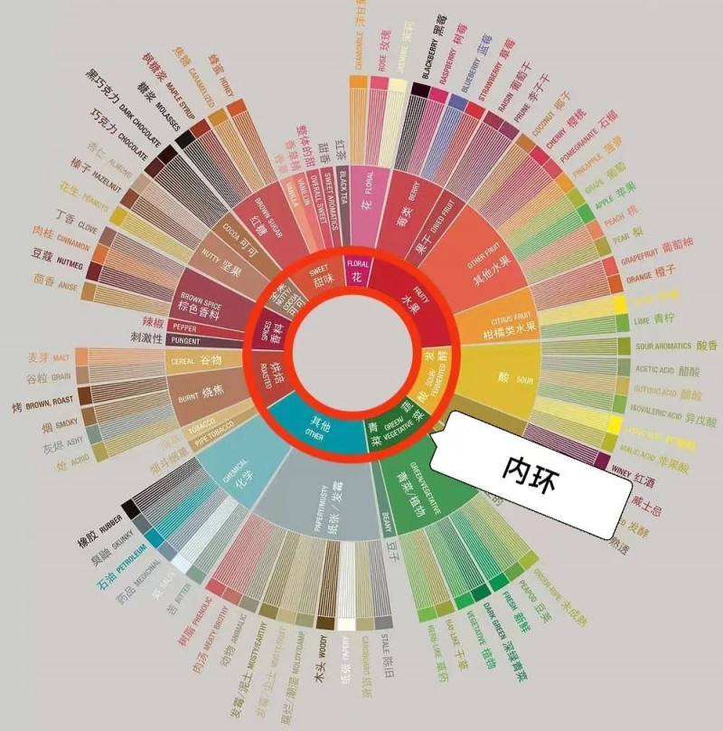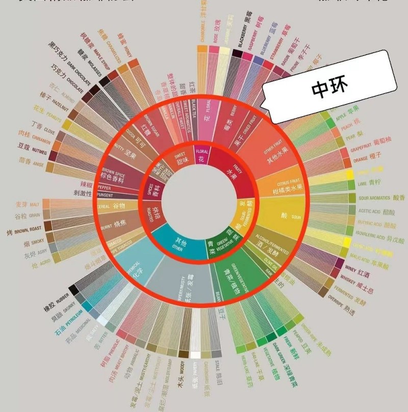 中環(huán)代表同一類別中的不同細(xì)分。我們在查找中環(huán)相對應(yīng)的感官描述詞時,首先要確定內(nèi)環(huán)類別,然后進(jìn)一步在此類別對應(yīng)的中環(huán)范圍內(nèi)查找。