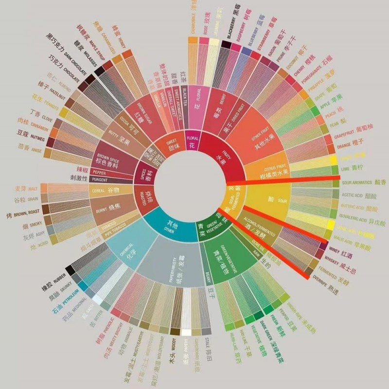 外環(huán)代表不同分類下的具體風(fēng)味。確定中環(huán)的風(fēng)味之后,然后進(jìn)一步在此風(fēng)味對應(yīng)的外環(huán)范圍內(nèi)查找。有個細(xì)節(jié)需要注意,外環(huán)中每個風(fēng)味之間的距離是不一樣的。距離大的代表兩個風(fēng)味辨識度高,味道相差距離大;距離近的代表兩個風(fēng)味辨識度低,味道相似。