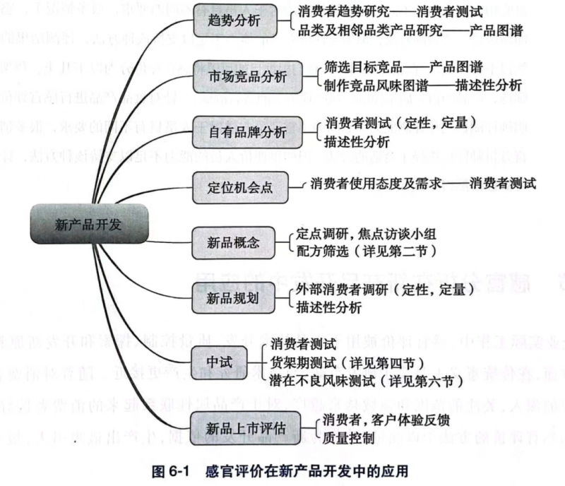 完整的新品開(kāi)發(fā)流程具有很多環(huán)節(jié),其中包含產(chǎn)品趨勢(shì)分析,自有品牌分析,新品概念的生成,產(chǎn)品線(xiàn)規(guī)劃,中試以及新品上市放行等。因此,在新品開(kāi)發(fā)中感官評(píng)價(jià)的方法是綜合性的,即多個(gè)感官測(cè)試貫穿于整個(gè)新品開(kāi)發(fā)流程中。常見(jiàn)方法分布見(jiàn)圖6-1。