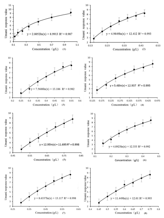 4.1基于電子舌探究8種不同濃度梯度的單一鮮味物質(zhì)的響應(yīng)變化規(guī)律,得出不同濃度梯度鮮味物質(zhì)的響應(yīng)值隨濃度的增加而增加,且鮮味響應(yīng)值與濃度呈正相關(guān)的半對數(shù)關(guān)系,8種鮮味物質(zhì)的曲線形狀和方程相似但不同,表明基于電子舌8種鮮味物質(zhì)呈味特性相似但又各具特點。