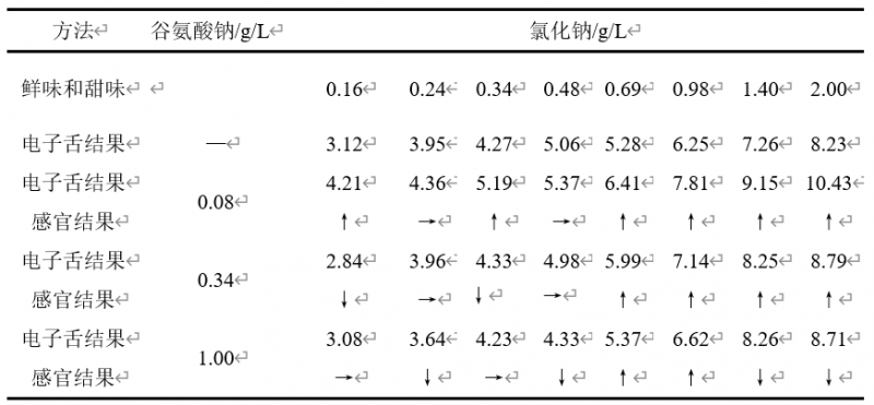按表稱取一定量的咸味物質(zhì)與不同濃度的鮮味物質(zhì)相互混合配成100mL的溶液,待用。通過電子舌和感官評價兩種方法對鮮味和咸味的二元相互作用結(jié)果進(jìn)行分析,結(jié)果見表2.7。