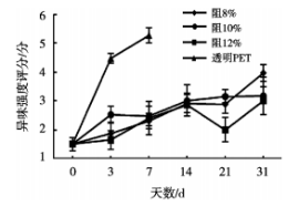 將3種不同質(zhì)量分?jǐn)?shù)的阻光色油PET瓶灌裝的鮮牛奶和透明PET瓶罐裝的鮮牛奶進(jìn)行0~31d感官品評(píng),品評(píng)時(shí)間點(diǎn)分別為0,3,7,14,21和31d,結(jié)果如圖1~圖4所示。在31d內(nèi)各樣品的整體喜好度均呈下降趨勢(shì),其中透明PET瓶明顯不受喜歡,在3d時(shí)整體喜好度平均值<5(透明PET各指標(biāo)只測(cè)試到7d),與3個(gè)阻光色油PET瓶裝樣品相比存在顯著性差異,3個(gè)不同質(zhì)量分?jǐn)?shù)的阻光色油PET樣品的整體喜好度平均值相比均無(wú)顯著性差異,整體下降趨勢(shì)不明顯,均優(yōu)于透明PET瓶樣品。