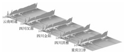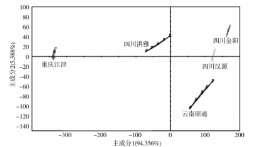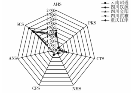 利用電子舌檢測儀自帶軟件對花椒魚片樣品的數(shù)據(jù)進(jìn)行主成分分析(PCA),結(jié)果見圖5。主成分1和主成分2的貢獻(xiàn)率分別為94.356%和5.388%,總貢獻(xiàn)率達(dá)99.744%,超過85%,表明這兩個主成分涵蓋了大多數(shù)樣品信息,可以用來表征花椒魚片樣品的滋味特征。5種樣品散點(diǎn)區(qū)域分散明顯,表明電子舌能夠較好地區(qū)分不同產(chǎn)地的花椒魚片。由圖5可知,重慶江津樣品組與其他4組樣品的滋味差異最大。由圖6可知,花椒魚片在傳感器SCS、AHS、CTS、NMS上響應(yīng)值較高,其中AHS、CTS、NMS分別為酸味、咸味、鮮味專一性傳感器,SCS為非專一性傳感器。差異性最大的SCS傳感器可能和青花椒中麻味物質(zhì)含量的高低有關(guān),其中重慶江津樣品組的響應(yīng)值最大。