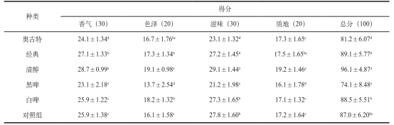 1.啤酒種類對啤酒鴨感官評分的影響