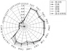 不同啤酒鴨在電子鼻各個傳感器上的響應值如圖1所示,在T30/1、P10/1、P10/2、P40/1和T70/2這五個探頭上,啤酒鴨的響應值存在明顯差異。