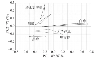 啤酒鴨電子舌檢測結果主成分分析如圖4。主成分1和主成分2的貢獻率分別為89.79%和7.70%,累計97.49%,說明這兩個主成分可以代表樣品整體信息。雖然不同啤酒鴨在電子舌傳感器上響應值差異較小,但利用主成分分析還是能將其明顯區(qū)分開,說明不同啤酒制作的啤酒鴨滋味存在差異,其中白啤組與其他組差異較大。