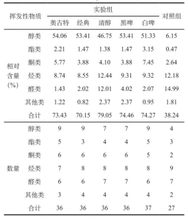 4.GC-MS結果分析通過GC-MS測定不同種類啤酒制作啤酒鴨樣品的風味物質(zhì)及其相對含量。各樣品鑒得醇類、酯類、醛類、酮類、烴類以及其他類(醚類、含氮類及呋喃等)揮發(fā)性化合物,其中來源于啤酒的醇類物質(zhì)占據(jù)實驗組最重要位置。由表3可知,實驗組所檢測的揮發(fā)性化合物,各樣品風味物質(zhì)含量皆不同,但醇類和烴類都為其主要化合物,種類及含量皆高于對照組。