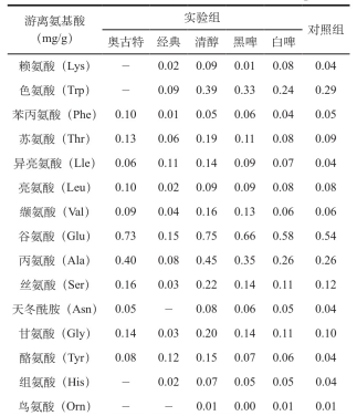 由表4可知,啤酒鴨中共檢測到16種游離氨基酸,其7種人體必需氨基酸中苯丙氨酸、蘇氨酸、異亮氨酸、亮氨酸、纈氨酸在所有啤酒鴨中均有檢出。清醇組及清水對照組中各氨基酸均能檢出(16種),白啤組氨基酸種類次之(15種),種類最少為奧古特組(11種)。