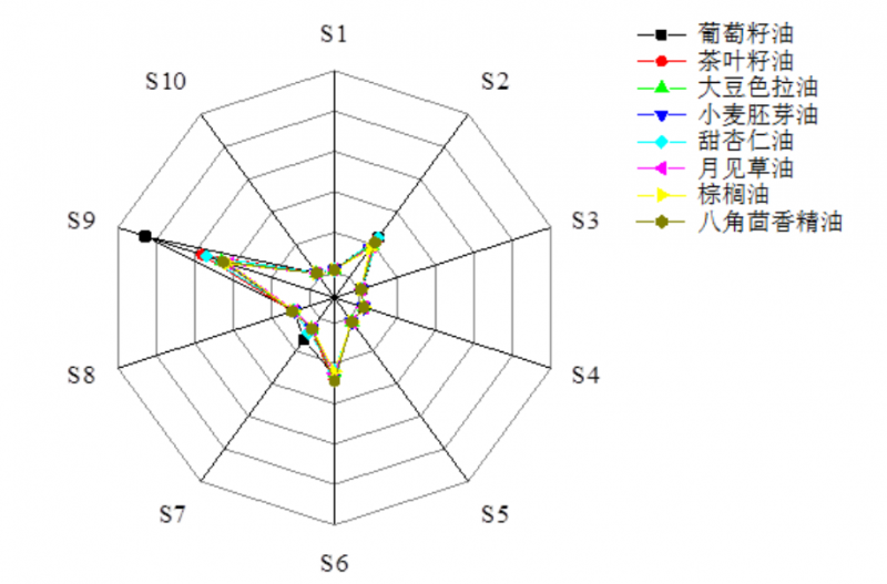 摻入植物油后的摻假八角精油樣品在色澤方面無顯著差異。下圖為純八角精油和摻假八角精油的雷達(dá)指紋圖譜,從圖中可以看出植物油摻假的八角精油和純八角精油之間的差異主要體現(xiàn)在S9號傳感器和S7號傳感器上,表明八角精油摻入植物油主要改變了其芳香類氣味,使其氣味體系發(fā)生了較大的變化。