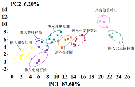 可見,應(yīng)用電子鼻結(jié)合PCA分析對摻入不同植物油的八角精油進(jìn)行鑒定,能夠很好地區(qū)分鑒別摻入不同的植物油(葡萄籽油、茶葉籽油、大豆色拉油、小麥胚芽油、甜杏仁油、月見草油和棕櫚油)。