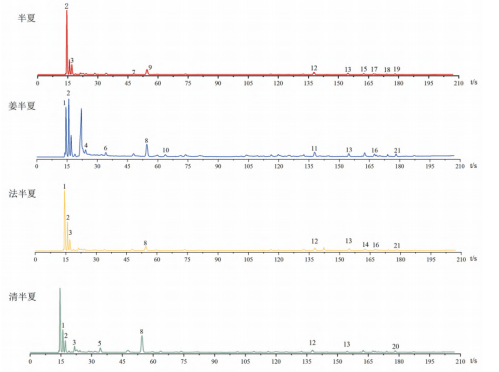 使用HeraclesⅡ超快速氣相電子鼻獲取半夏不同炮制品的氣相色譜圖,利用多元分析方法,得到半夏不同炮制品的氣味差異標志物。