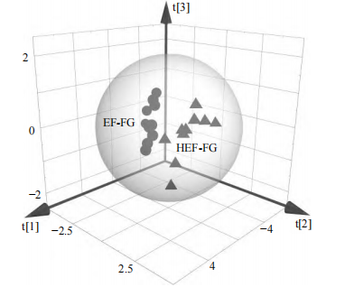 對EF-FG和HEF-FG2組樣本進行PCA,結果見圖5。結果表明2組樣本處于2個不同方位,并存在著明顯組內差別,第1主成分和第2主成分的變異數貢獻率均為96.90%(>70%),因此,EF-FG和HEF-FG可以利用電子舌進行區(qū)分。