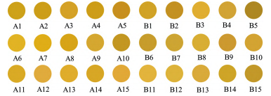 以明度值(L*)、紅綠值(a*)和黃藍值(b*)3個指標來表示每個色號,計算總色值(E*ab)。其中L*的范圍由0~100對應表示顏色由黑到白;a*由正到負對應表示顏色由紅到綠;b*由正到負對應表示顏色由黃到藍,計算公式為E*ab=[(L*)2+(a*)2+(b*)2]1/2,E*ab越大,顏色越淺。除此之外,可用總色差值(ΔE*ab)表示2個色號之間的色差,但其不能表示顏色的偏向,計算公式為ΔE*ab=[(ΔL*)2+(Δa*)2+(Δb*)2]1/2。樣品A1~A15和B1~B15的色度值見表3,電子眼圖像見圖6。