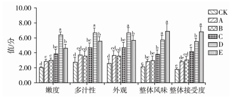 牛肉適口性得分受烹飪方法和煮熟程度的影響。對牛排從5個維度(嫩度、多汁性、外觀、整體風味和整體接受度)進行感官評價,分析成熟度對其感官品質的影響,見圖1。