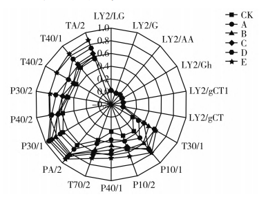 由圖1可知,熟度對牛排感官品質具有顯著性影響(P<0.05),隨著熟度的增加,牛排在嫩度、多汁性和外觀上先升高后降低,當熟度為七分熟時,其值最高。牛排整體風味和整體接受度隨著成熟度的增加,不斷增加,在樣品E中具有最高值。電子鼻分析