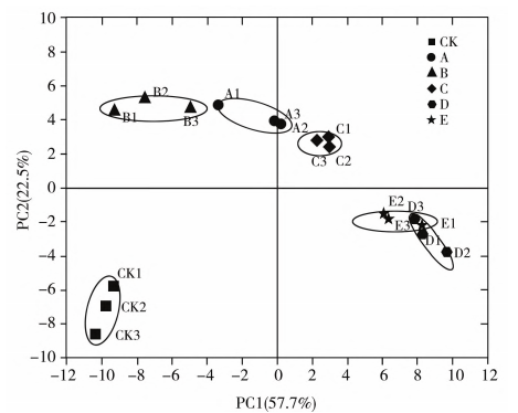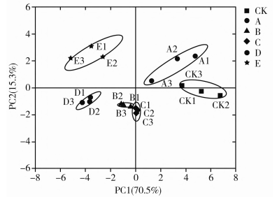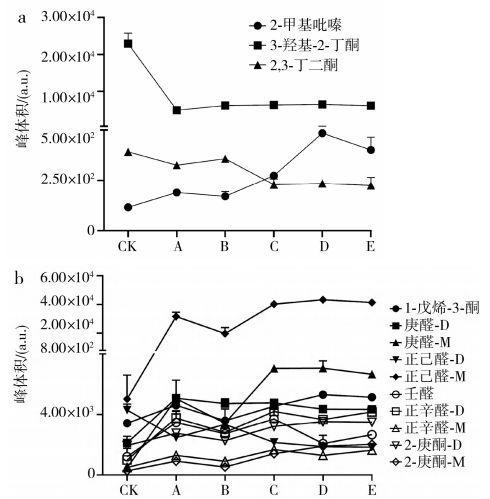 與樣品CK相比,部分化合物在樣品A、E中具有較高的含量,說明這部分物質是烹飪后產生的,牛排在烹飪過程中由于高溫產生的美拉德反應或者脂質的熱分解產生的一系列揮發(fā)性風味物質,導致烹制后的牛排風味更豐富。