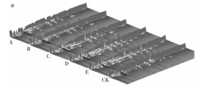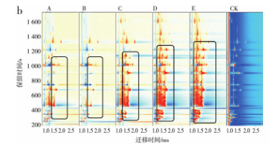 圖4是6種不同烹飪熟度的牛排揮發(fā)性風味化合物譜圖,圖中每個點代表一種物質,淺色表示濃度較低,深色表示濃度較高,顏色越深表示濃度越大7。由圖4可知,牛排的揮發(fā)性風味物質能通過GC-IMS得到很好的分離,其中圖中標記的橫線和方框處為6種不同熟度牛排中的差異性化合物,隨著牛排成熟度的增加,樣品中化合物的數量和濃度不斷增加,并且均高于對照組,其中在樣品A、B中,化合物的整體濃度較相似,即牛排介于一成熟和三成熟之間時,樣品的整體風味輪廓較相似,而在樣品D、E中,化合物的整體風味物質的濃度較相似,說明牛排介于七成熟和九成熟之間時,樣品的整體輪廓較相似,與前文電子鼻結果一致。