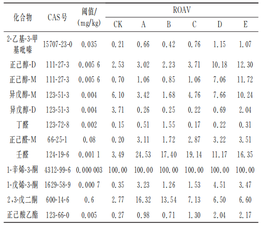 并不是樣品中化合物的含量越高,其對整體風味貢獻就越高,而是需要結合其閾值一起分析,相對氣味活度值用來判定樣品中對整體風味貢獻較大的物質,見表1。