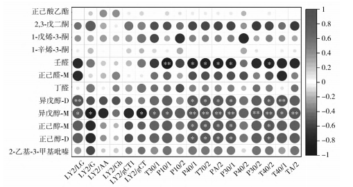 為研究電子鼻傳感器與香氣化合物之間的關系,采用Pearson相關系數對電子鼻傳感器與ROAV>1的香氣化合物進行相關性分析,見圖8。由圖8可知,電子鼻的T和P傳感器與大多數化合物有相關性,比如T30/1、P1O/1、P¹0/2、P40/1、T70/2、PA/2、P30/1、P40/2、P30/2、T40/2、T40/1、TA/2,傳感器與樣品中的異戊醇-D、異戊醇-M、正己醇-M、正己醇-D、2-乙基-3-甲基吡嗪具有較高的正相關性,并且異戊醇-M與大多數T和P傳感器具有極顯著性(P<0.01);而壬醛與P10/1、P40/1、T70/2、PA/2、P30/1和T40/2傳感器具有顯著性負相關(P<0.05)。