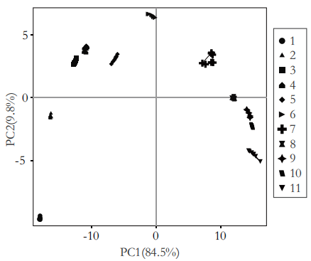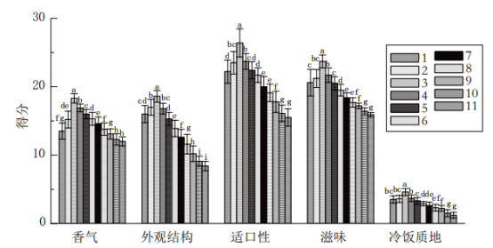 對11種樣品進(jìn)行電子眼的主成分分析(PCA),由圖1可知,PC1的貢獻(xiàn)率為84.5%,PC2的貢獻(xiàn)率為9.8%,2個主成分的總貢獻(xiàn)率為94.3%,可以用來解釋樣品絕大部分信息。各樣品之間離散分布,均無交叉重疊,表明電子眼能夠鑒定出各樣本的顏色差異。隨著苦蕎米添加量的增大,苦蕎米飯的顏色變得越來越暗沉,黃褐色加深,光澤越來越差。在主成分分析圖中隨著苦蕎米添加量的增加,樣本逐漸從X軸的左軸向右軸移動,表明隨著苦蕎米比例增加顏色呈現(xiàn)規(guī)律變化。由于主成分1的貢獻(xiàn)率較大,因此可以根據(jù)樣本在X軸上的距離判斷樣本之間的差異。3與4號樣品顏色相似,9~11號樣品顏色相似,其余樣品顏色差異較大。