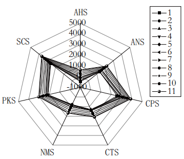 02不同比例苦蕎米飯的滋味差異分析對所有樣品電子舌傳感器的響應(yīng)值繪制雷達(dá)圖(圖2),其中SCS傳感器、CPS傳感器的響應(yīng)值最高,其次是ANS傳感器、CTS傳感器、PKS傳感器的響應(yīng)值較高。通過味覺分析比較發(fā)現(xiàn)不同比例苦蕎米飯的滋味呈現(xiàn)一定的規(guī)律性,隨著苦蕎米添加量的增大,各傳感器的響應(yīng)值也隨之增大。上述結(jié)果表明,不同比例的苦蕎米飯滋味會因苦蕎米添加量的不同而逐漸變化。