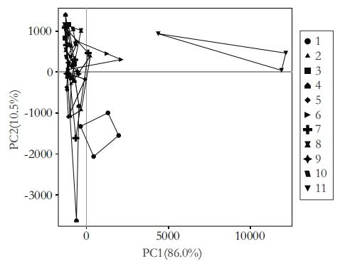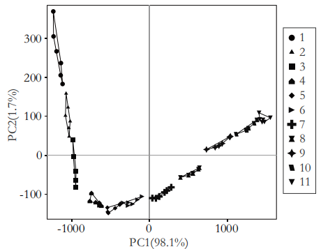由圖3可知,第一和第二主成分貢獻(xiàn)率之和達(dá)到99.8%,即這2種主成分涵蓋了11組樣本絕大部分的原始數(shù)據(jù)信息,其中PC1的貢獻(xiàn)率為98.1%,PC2的貢獻(xiàn)率為1.7%,且樣本間的差異主要表現(xiàn)在第一主成分上。各樣本之間均無重合,表明電子舌技術(shù)能夠明顯地將不同比例苦蕎米飯區(qū)分。在PCA圖中隨著苦蕎米添加量的增加,樣本逐漸從X軸的左軸向右軸移動,各樣本在滋味上呈現(xiàn)一致規(guī)律,表明隨著苦蕎米比例增加滋味逐漸變化。由于PC1的貢獻(xiàn)率大,所以樣本在橫坐標(biāo)上的距離越大,表明了樣本之間的差異越大。結(jié)合圖2可知,苦蕎米添加量越高,酸味、咸味、鮮味、基本味的響應(yīng)值越大,與PCA圖的變化趨勢相對應(yīng),其中4號樣與3號樣品距離較遠(yuǎn),4號樣品開始出現(xiàn)滋味加重的現(xiàn)象,與3號樣品差異明顯。