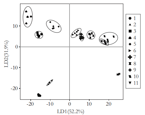 03不同比例苦蕎米飯氣味分析由于圖4中樣本間相互重疊,組內(nèi)樣品分布離散,分類效果并不理想,PCA不能區(qū)分樣本間的差異,故進(jìn)行線性判別分析(LDA)。LDA結(jié)果如圖5所示。由圖5可知,LD1的貢獻(xiàn)率為52.2%,LD2的貢獻(xiàn)率為31.9%,其累計貢獻(xiàn)率為84.1%,能夠反映樣品中的大部分氣味信息。1、2、11號樣本與其余樣本距離較遠(yuǎn),表明了1、2、11號樣本與其余樣本之間的差異較大。6~10號樣本距離較近,存在部分重疊現(xiàn)象,說明這幾組樣本氣味相似,并且隨著苦蕎米添加量的增大,樣本呈現(xiàn)出從左向右依次移動的趨勢。1、2號樣本米飯的香味較重、苦蕎的香味較淡,苦蕎香味從3號樣本開始逐漸明顯,11號樣本苦蕎味過重。綜上所述,電子鼻結(jié)合線性判別分析可較好地區(qū)分不同比例苦蕎米飯。