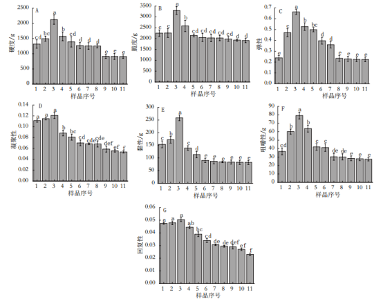 經(jīng)電子鼻鑒定,共鑒定出30種揮發(fā)性化合物,包括烷烴類、醇類、醛類、酯類及其他化合物。其中十一烷、十二烷、十三烷、十四烷、正十五烷、乙基苯、萘、壬醛、反式-2-壬烯醛、苯乙烯、2-十一酮、1-壬醇、1-辛烯-3-醇、十二醛的含量隨著苦蕎米添加量的增大而增大;己醛、1-丙醇、1-丁醇、2,3-戊二酮、2-庚酮、2-甲基丁醇、異丁醇、丁醛、2-甲基丁醛、異戊醇、戊醛、香草醛、鄰苯二甲酸二甲酯、棕櫚酸乙酯、棕櫚酸甲酯、乙酸丁酯的含量隨著苦蕎米添加量的增大而減小。此外,乙基苯、苯乙烯產(chǎn)生植物的味道,棕櫚酸甲酯產(chǎn)生鳩尾草的味道;壬醛、反式-2-壬烯醛、十二醛具有宜人的橘子香;1-壬醇、1-辛烯-3-醇、己醛、1-丙醇、1-丁醇、異戊醇、乙酸丁酯產(chǎn)生水果香味;2-十一酮、2,3-戊二酮、香草醛、棕櫚酸乙酯散發(fā)令人愉悅的奶油味;2-庚酮、2-甲基丁醛、戊醛具有堅果香;萘、2-甲基丁醇、丁醛則會產(chǎn)生一些令人不愉快的氣味。04不同比例苦蕎米飯的質(zhì)構(gòu)特性分析