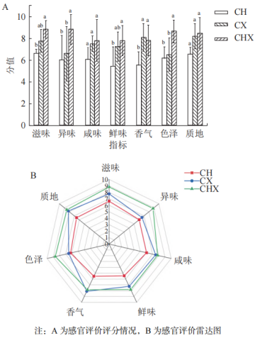 3種食用菌素肉排人工感官評(píng)價(jià)評(píng)分情況如圖3A所示。結(jié)合人工感官評(píng)價(jià)雷達(dá)圖(圖3B)分析樣品整體感官評(píng)分情況。海鮮菇素肉排整體感官評(píng)分優(yōu)于其他兩種,所有指標(biāo)平均分值均在 7~10 分;其次為香菇素肉排,在質(zhì)地、滋味、咸味、鮮味方面的評(píng)分略遜于海鮮菇素肉排,存在輕微苦澀味,且色澤不佳;而猴頭菇素肉排整體感官評(píng)分均低于其他樣品,各指標(biāo)平均分值均低于7分。