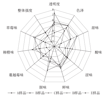 本研究對(duì)不同果味的膠原蛋白肽固體飲料的透明度、色澤、甜味、酸味、澀味、鮮味、腥味、蔓越莓味、柳橙味、草莓味和整體強(qiáng)度進(jìn)行了主成分分析,當(dāng)提取到2個(gè)主成分,累積的方差貢獻(xiàn)率達(dá)到91.77%,說(shuō)明這2個(gè)主成分可以涵蓋不同果味膠原蛋白固體飲料的大部分信息。如圖2所示,不同果味膠原蛋白固體飲料分散在各個(gè)區(qū)域,兩點(diǎn)之間距離越長(zhǎng),說(shuō)明兩個(gè)樣品的整體感官品質(zhì)差異越大;同時(shí)兩點(diǎn)距離越短,說(shuō)明兩個(gè)樣品間感官品質(zhì)含量差異越小,感官品質(zhì)較為相近。從PCA圖中,可以直觀地看到5款樣品的感官屬性各具特點(diǎn)。其中A樣品與其他樣品差異最大,故分布于F1的負(fù)半軸,風(fēng)味特征主要表現(xiàn)為腥味強(qiáng)、透明度高,其他感官屬性不明顯。B樣品的風(fēng)味特點(diǎn)主要為柳橙味比較強(qiáng),故分布在F2的負(fù)半軸;C、D和E樣品分布距離比較近,其特征表現(xiàn)為透明度、色澤和甜度等感官屬性比較接近。