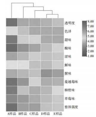 對(duì)不同果味膠原蛋白肽固體飲料的感官屬性強(qiáng)度進(jìn)行熱圖聚類分析的結(jié)果見圖3。5種樣品大致可分為3類,即C、D和E最先聚為一類,其透明度、色澤和甜味等方面的感官性質(zhì)較為相似,說(shuō)明蔓越莓味和草莓味在感官上整體相似;第二類為B樣品,其柳橙味和色澤較為突出;第三類為A樣品,其在透明度表現(xiàn)最突出,這與主成分分析呈現(xiàn)了相同結(jié)果。同時(shí)發(fā)現(xiàn)A樣品為純膠原蛋白肽粉呈現(xiàn)出的腥味較濃,而B、C、D、E這4款膠原蛋白肽固體飲料樣品腥味較淡,這4款產(chǎn)品配方中添加了果粉,說(shuō)明果粉有效掩蓋了膠原蛋白肽的腥味。