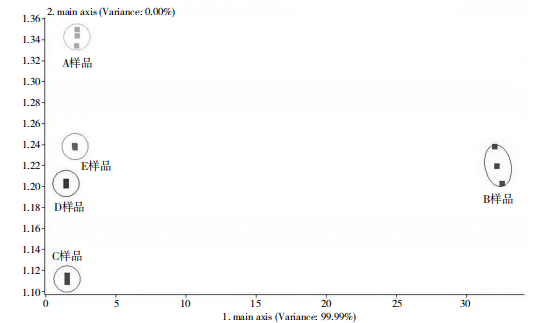利用電子鼻對(duì)5種不同果味膠原蛋白肽固體飲料的揮發(fā)性成分進(jìn)行測(cè)定后,將采集得到的數(shù)據(jù)進(jìn)行主成分分析,分析結(jié)果如圖4所示。第1和第2主成分的累積貢獻(xiàn)率達(dá)到99.99%,說(shuō)明電子鼻對(duì)其揮發(fā)性成分表現(xiàn)出較高的識(shí)別度和靈敏度。總體看,各樣品的揮發(fā)性成分有各自的分布位置,基本沒(méi)有重合,說(shuō)明電子鼻對(duì)于5種樣品氣味的區(qū)分度總體較好,所有樣品的風(fēng)味相對(duì)獨(dú)立,原因可能是因?yàn)椴煌赌z原蛋白肽固體飲料的配方組成存在一定差異,所以在不同果味膠原蛋白肽固體飲料形成的揮發(fā)性成分亦有所不同。C、D和E樣品在第1主成分上的相距較近,但在第2主成分上能完全區(qū)分開,說(shuō)明草莓味和蔓越莓味的膠原蛋白肽固體飲料的氣味上略有相似,而B樣品在第1主成分上與其他樣品相聚甚遠(yuǎn),說(shuō)明柳橙味的膠原蛋白肽固體飲料氣味與其他樣品差異最為明顯。根據(jù)感官結(jié)果發(fā)現(xiàn)A樣品在氣味上主要呈現(xiàn)腥味,B樣品為柳橙味的膠原蛋白肽固體飲料與A樣品在氣味上相差甚遠(yuǎn),從電子鼻分析結(jié)果得出,柳橙味的果粉相比較蔓越莓和草莓味的果粉的掩腥效果更好。