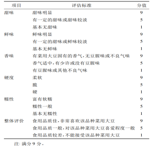 感官評(píng)定小組由江蘇省農(nóng)業(yè)科學(xué)院豆類研究室的8名老師及研究生組成。采用9分嗜好法對(duì)菜用大豆進(jìn)行感官評(píng)定,1、5、9分分別表示極度不能接受、一般、非常喜歡。結(jié)果表示為評(píng)分的平均值。感官評(píng)定標(biāo)準(zhǔn)詳見(jiàn)表1。