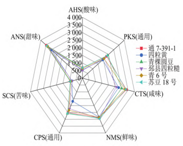 3 結(jié)論在感官評(píng)價(jià)方面,蘇豆18號(hào)更受消費(fèi)者喜愛(ài)。在電子舌檢測(cè)結(jié)果中,蘇豆18號(hào)的鮮味的電子舌響應(yīng)值最高,通7-391-1的甜味響應(yīng)值最高。此外,通過(guò)人工感官評(píng)價(jià)和電子舌滋味響應(yīng)值數(shù)值進(jìn)行相關(guān)性分析,二者在鮮甜味方面呈現(xiàn)極顯著相關(guān)性,這說(shuō)明電子舌與人工感官評(píng)價(jià)的結(jié)果在菜用大豆甜味和鮮味上具有高度一致性。