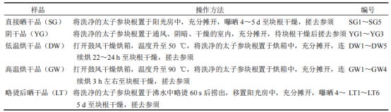 不同加工品的表面和斷面特征見圖1,5類加工品的外形沒有較大的差異,而略燙后曬干品的斷面以深黃色為主,其他加工品的斷面為黃白色至淺黃色。