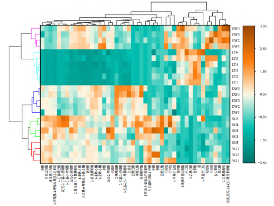 圖3 不同加工品的氣味成分聚類分析熱圖