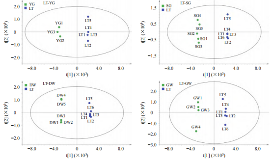 圖4 略燙后曬干品與其他加工品的OPLS-DA得分散點圖