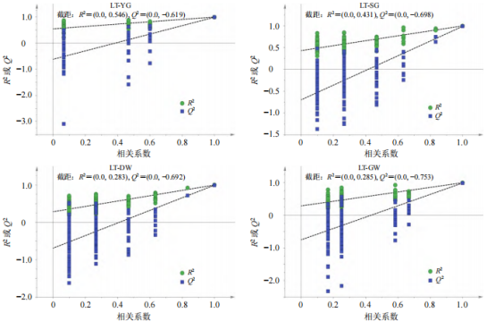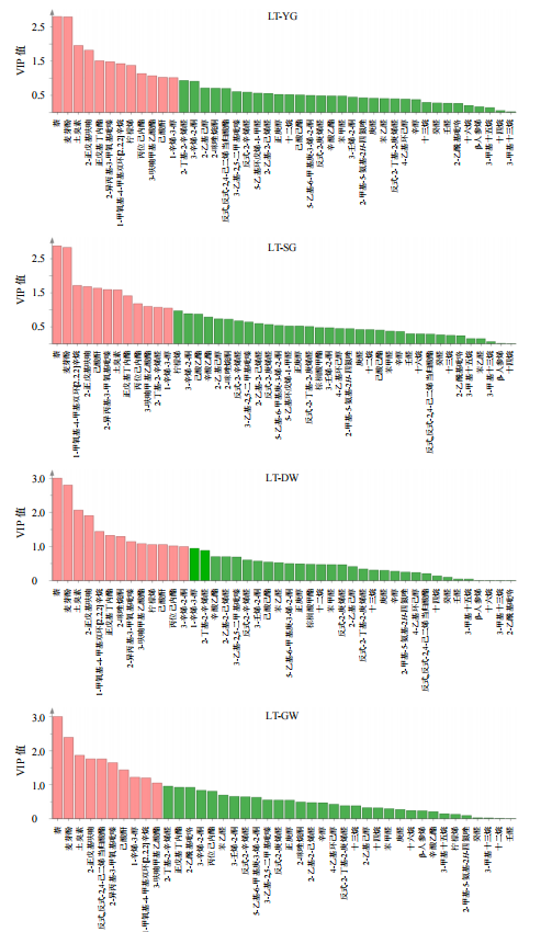 略燙后曬干品與其他加工品的氣味差異分析利用OPLS-DA將該加工品與市場主流的陰干品、直接曬干品、低溫烘干品、高溫烘干品分別進行比較并進行置換檢驗,確認4組比較分析均未出現(xiàn)過擬合,將變量重要性投影(VIP)大于1的成分視為主要差異成分。得分散點圖見圖4,置換檢驗圖見圖5,VIP圖見圖6。