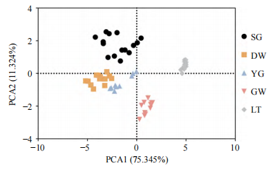 輸出弱極性柱與中極性柱的Heracles NEO超快速氣相色譜圖(圖8),利用AlphaSoft軟件自動對齊色譜峰,篩選出判別能力大于0.850的特征峰,總共得到15組可用于比較分析的色譜峰,將峰面積數(shù)據(jù)分別視作不同傳感器的響應值,進行歸一化處理,對23批次樣品進行PCA。結果(圖9)顯示,PCA1與PCA2之和大于80%,直接曬干品、陰干品、低溫烘干品3組加工品的距離較近,略燙后曬干品單獨位于一個象限并且與其余4組加工品的距離均較遠,這與本課題組產(chǎn)地調(diào)研所得出的“略燙后曬干品與其他加工品的氣味具有明顯差異”的結論契合。