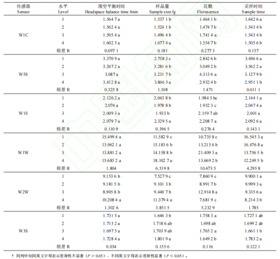 不同因素對(duì)電子鼻響應(yīng)特性的影響不同因素對(duì)電子鼻各傳感器(W1C、W5S、W1S、W1W、W2W和W3S傳感器)的影響見表1。從表3可知,不同因素對(duì)電子鼻測定櫻花花香的影響差異顯著,對(duì)電子鼻傳感器的響應(yīng)影響從大到小依次是不同花期、樣量、采樣時(shí)間,在不同頂空平衡時(shí)間因素下電子鼻各傳感器響應(yīng)極差均最小。從各因素的不同水平看,在不同頂空平衡時(shí)間因素中,水平1、4高于水平2、3;樣品量中水平4的電子鼻各傳感器響應(yīng)值顯著高于其他水平,水平1、2、3差異不顯著;在不同花期因素下,除了W1S傳感器之外,其余傳感器在水平3時(shí)的響應(yīng)值高于其他水平,且與其他水平差異極顯著;采樣時(shí)間中各水平差異不顯著。說明電子鼻對(duì)盛開時(shí)期的櫻花花朵且樣品量為4g時(shí)響應(yīng)較大。